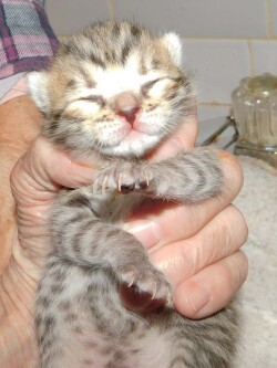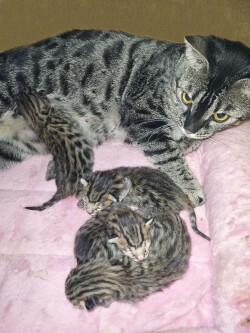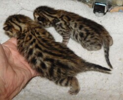 I have 4 Cheetoh cubs born 11-21 3 of which are still available. There are 2 boys and 2 girls. These are ENORMOUS kittens. Pictures of them are at 4 days old - big as week old kittens. Pictures of mom Juliet and babies below.