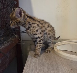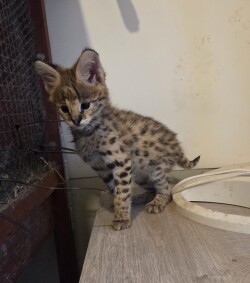 Born September 17, 2025, this handsome male serval is looking for his forever home! He’s bottle-fed, well-socialized, and already eating a raw diet. Raised with care and attention to ensure a healthy, thriving companion.