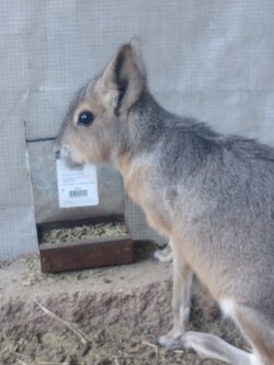 2 and a half month old female Mara ? for a new ?. Bottle raised and friendly but does tend to act like she was mom raised ? Comes up and accepts love, pets and treats but runs if you try to pick her up or if she THINKS you want to pick her up lol.