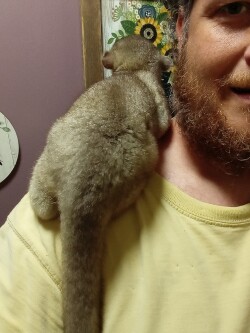He is sweet. A little shy. Bottle raised. 10 months old. He will take treats from you. When in the mood still will rub on you wanting petting on. Please do your research about kinkajous. They are not for everyone. They take time to bond with new owner. Any questions please feel free to message.