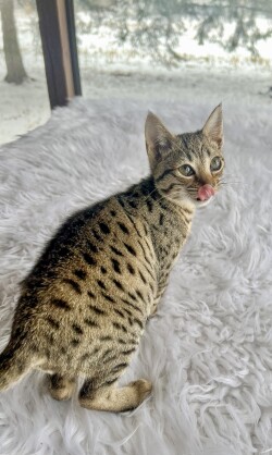 For sale. One Brown Spotted F7 SBT Savannah Kitten female. "Noel" is loaded with dark inky spots. She has perfect markings with absolutely no rib bars. She has super bright, clean whites and terrific color and contrast the photos don't do her justice. She has THE SWEETEST personality! Noel is ready for her forever home. She will make someone very, very happy this Christmas! Will hold until Dec 23rd, 2025 with 50% deposit. For more information, please visit our website http://www.myexoticcats.net or text/call (614) 400-2409