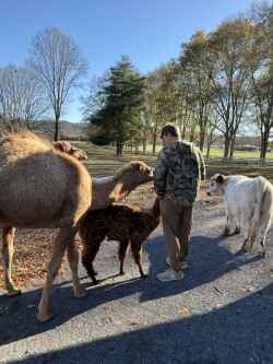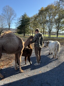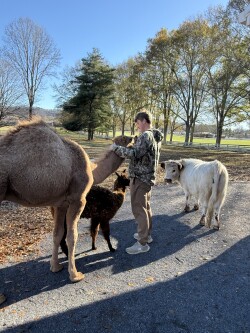 9 month old female dromedary camel for sale. Shelley is a sweet, affectionate well behaved camel. She has been housed with a 9 month old unrelated males camel and is pastured with horses. Up to date on everything. There is nothing wrong with her, we are over our skis and don’t know anything about camels and there is no one near us to consult with. Discount available if both go together. The female is the darker camel.