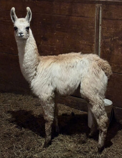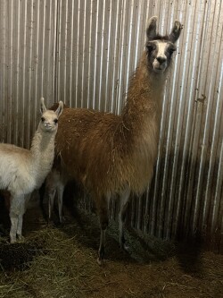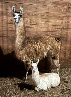 Adult llama female with her 3.5 month old male cria. The little guy does have a slight wry nose but it doesn’t negatively affect him at all. He is eating hay and grain, but will need to nurse a few more months. New London OH