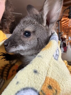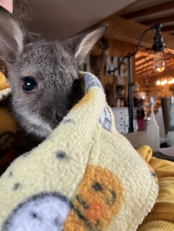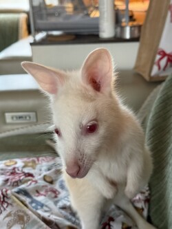 Three male albino Wallaby Joey‘s and one brown female, Wallaby Joey. All have a brown parent and an albino parent. Two of the albino male Joey’s are not Related to the brown female. USDA facility located in Princeton Illinois. Cloud 9 Wallabies and Exotics.