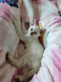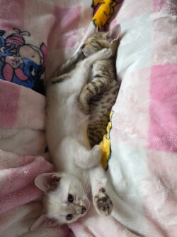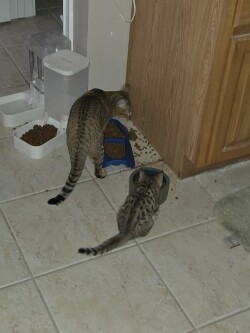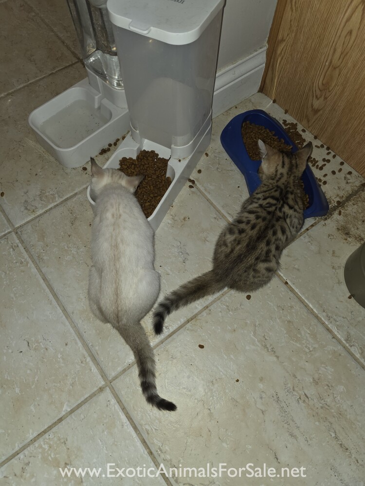 One male normal colored and one female snow Savannah Kittens. 8 weeks old. Both parents are F5. Used to running around in our house. Price negotiable.