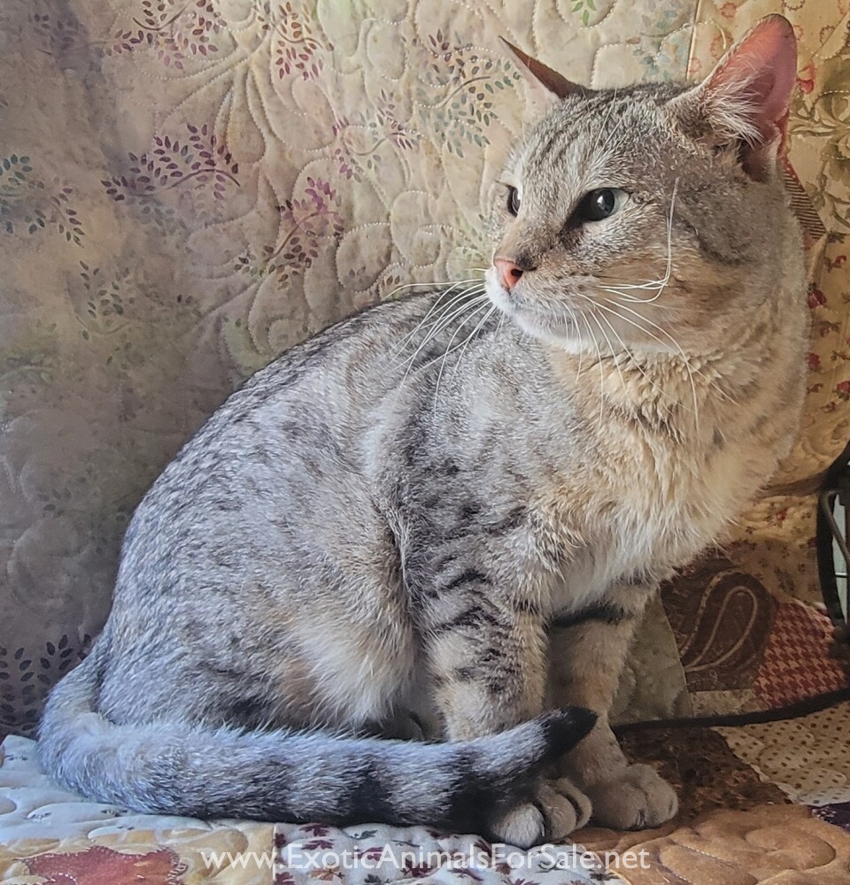 Not the best photo of him. Captian is a almost 4 year old proven TICA F5 Savannah male. He is really good with other cats. Doesn't care about dogs and tolerates humans. You can pet him and hold him he isnt the biggest fan of it. The more attention...