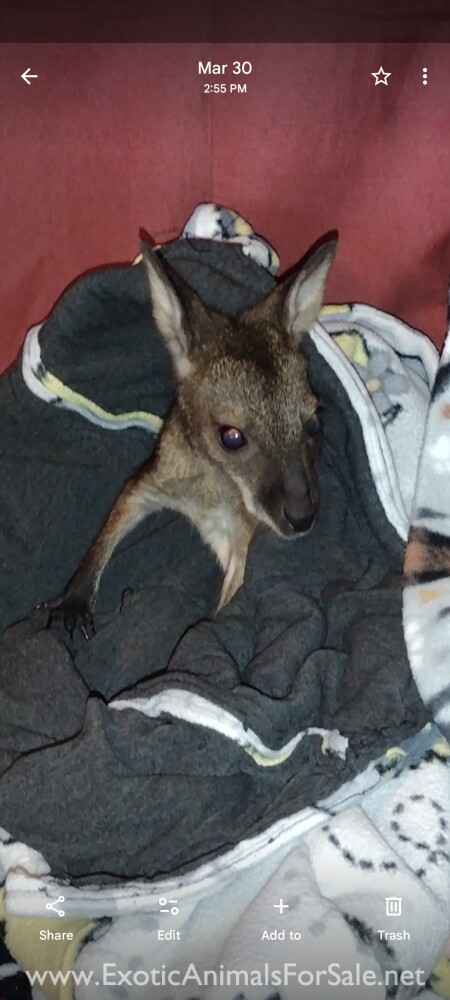 Bottle baby female Bennett wallaby. Pulled 3/26. Taken 4 bottles a day of fox valley formula. She will come with a care package. I will only answer to text. Scammers need not reply.