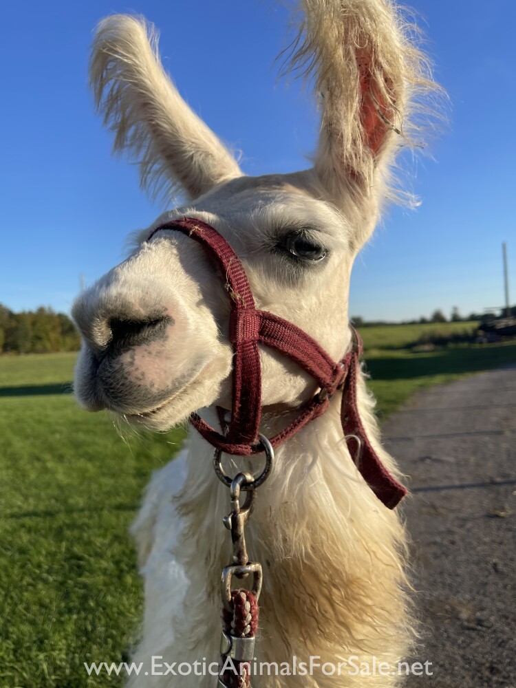 Super gentle intact yearling blue eyed suri llama. Unregistered. Leads, stands tied, stands to be bathed, and loads in the trailer with zero issues. He also has super speckled skin. Super well mannered and easy to get along with. Does have some stain...