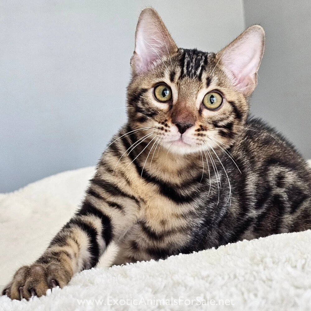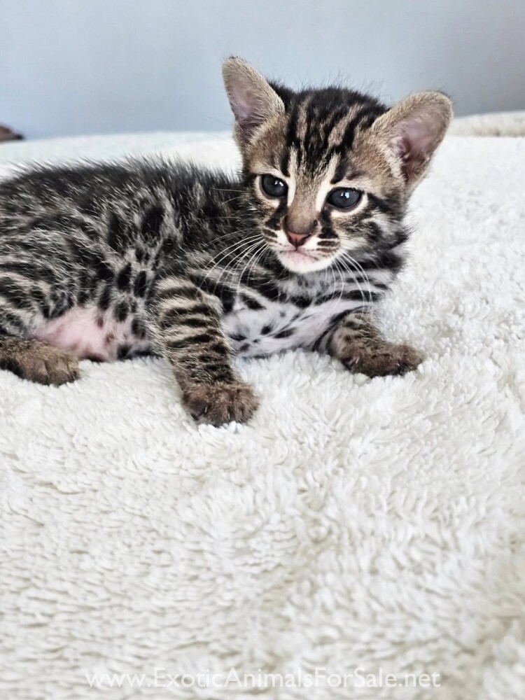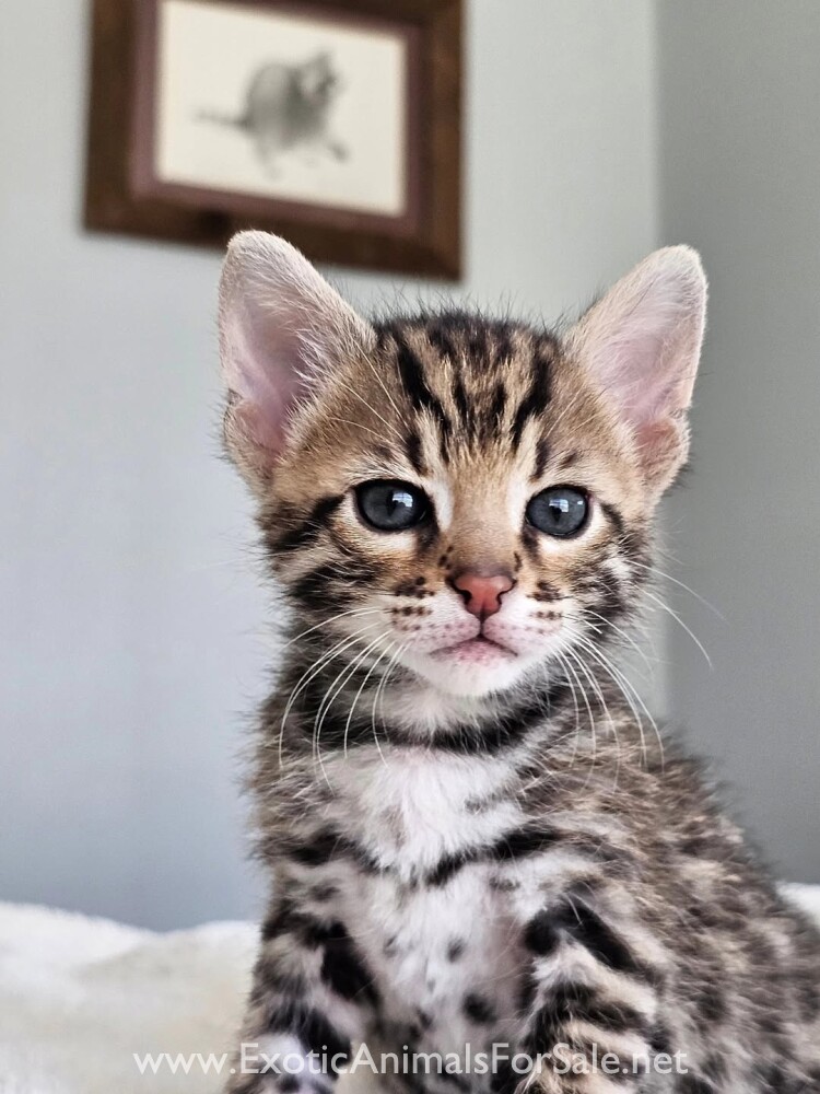 Adorable baby girl! Bold markings, tiny ears, poofy whisker pads, and a very even flow to her pattern. Very sweet dispostion and loves cuddle time. We set aside playtime each and every day to develop a strong bond with our babies. Regular playtim...