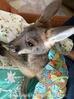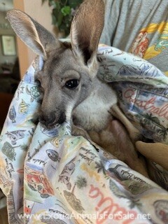 We have one bottle baby female Red Kangaroo Joey available now. She is roughly 5 months old, recently pulled, and currently on 5 bottles per day. She will be highly socialized and very sweet. We are USDA licensed, serious inquiries only.